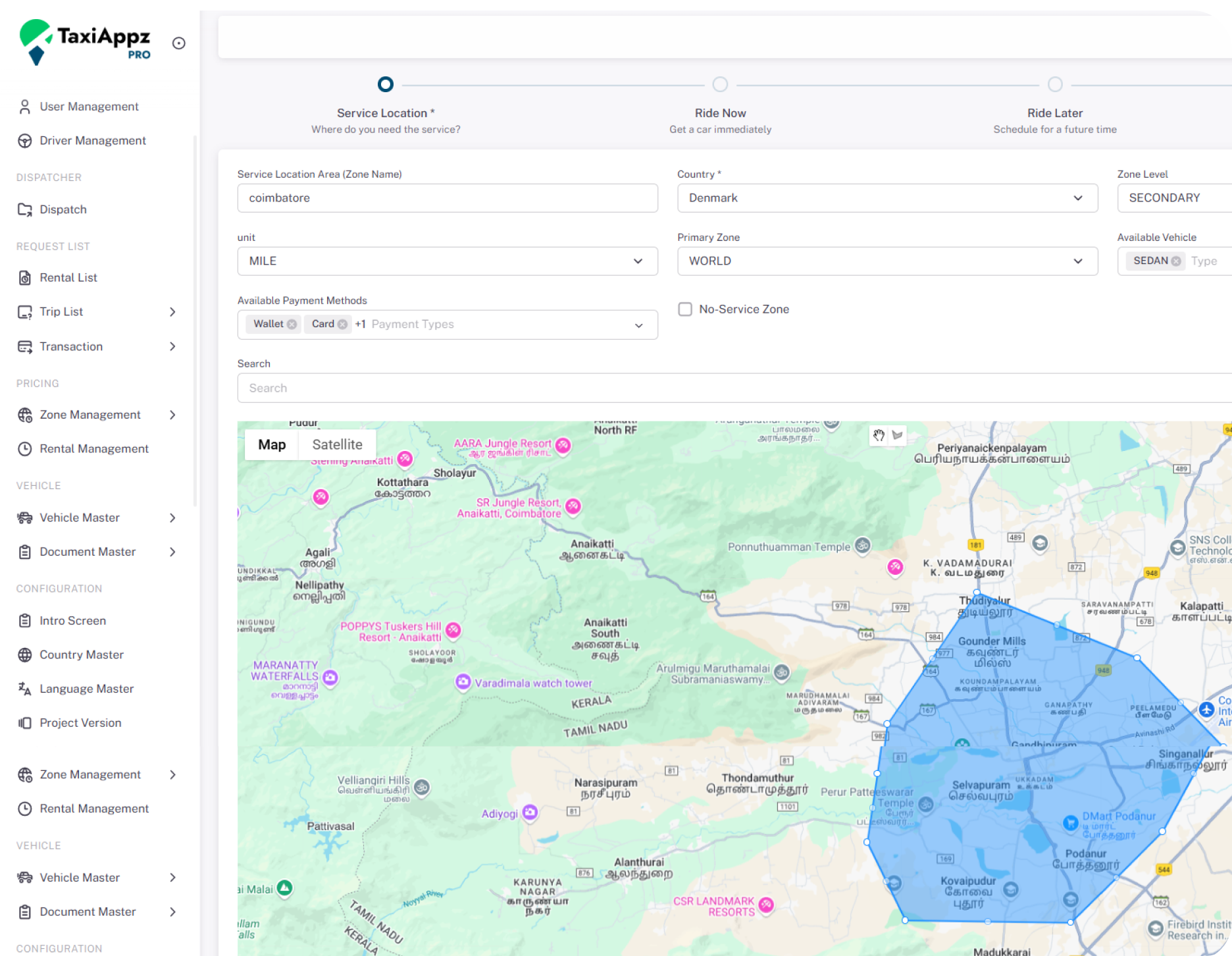 Create zones with boundaries and names. Manage operations, including currency and vehicle types.